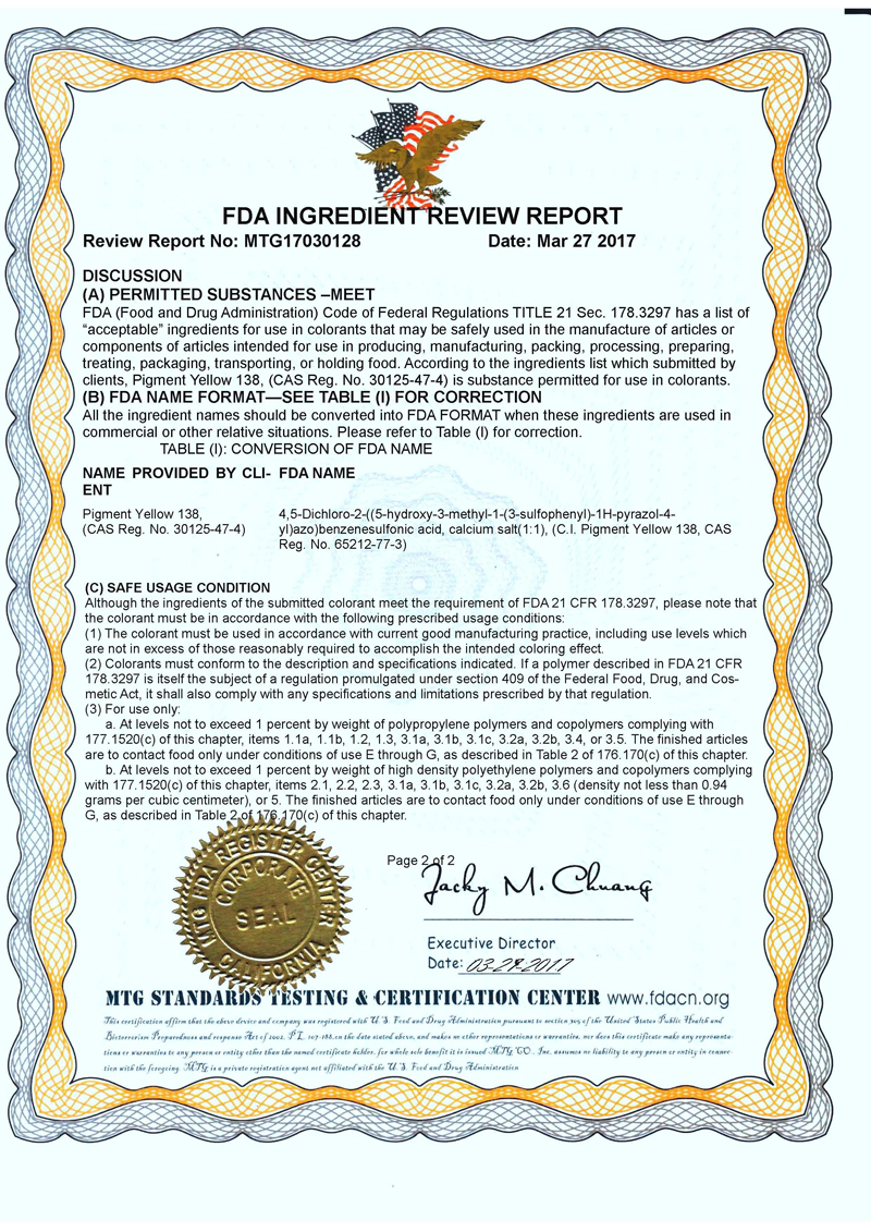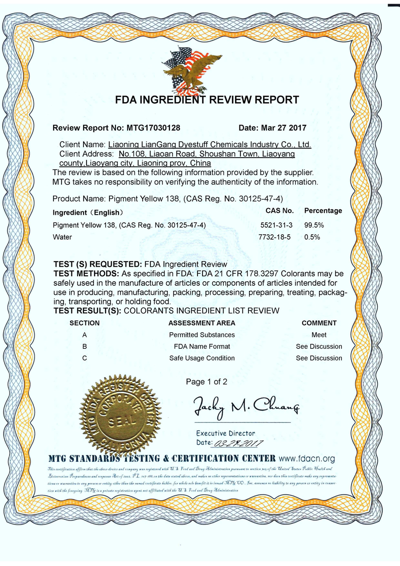 顏料黃138 (Pigment Yellow 138) 已通過(guò)FDA認(rèn)證