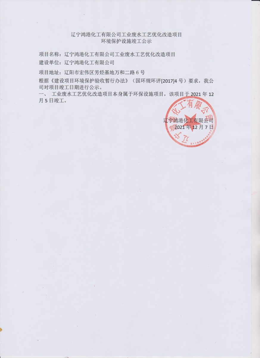 遼寧鴻港化工有限公司工業(yè)廢水工藝優(yōu)化改造項(xiàng)目環(huán)境保護(hù)設(shè)施竣工公示