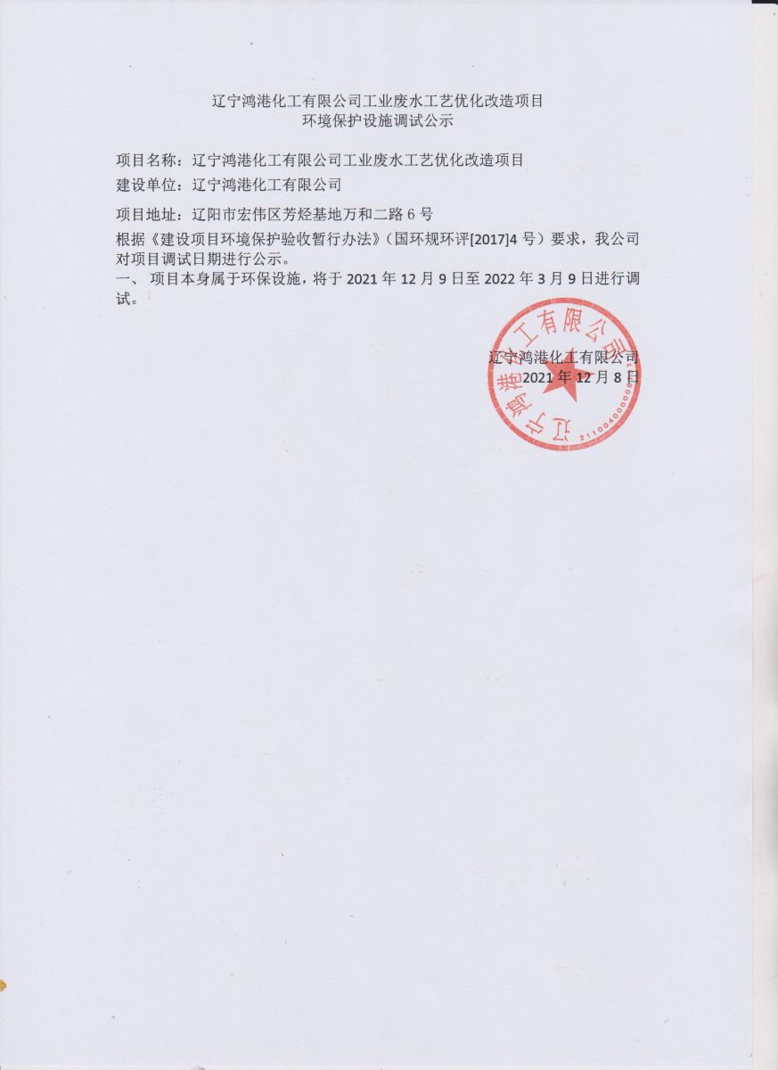 遼寧鴻港化工有限公司工業(yè)廢水工藝優(yōu)化改造項目環(huán)境保護設(shè)施調(diào)試公示